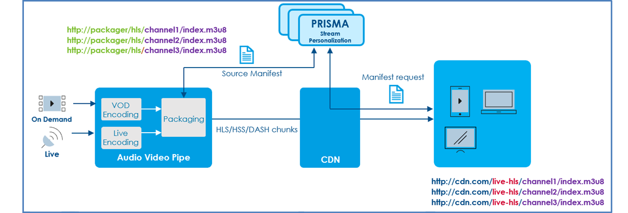 The same applies for manifests generated locally by the packager with URLs like for instance: http://packager/hls/channel1/index.m3u8. In addition, those channels are likely to share common attributes like replacement strategy, streaming protocol etc. Configuring one stream personalization service per channel would thus not make sense.