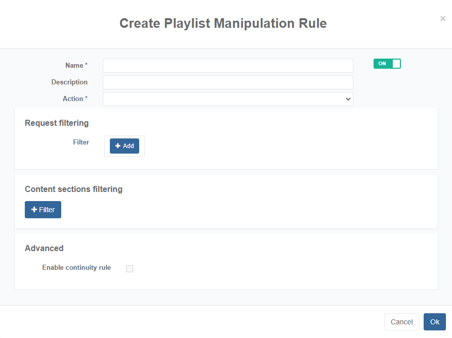 The Processing rules tab allows you to create and manage some manipulation rules (keeping or removing content) for your playlist by adding Request filters and Content sections filters.