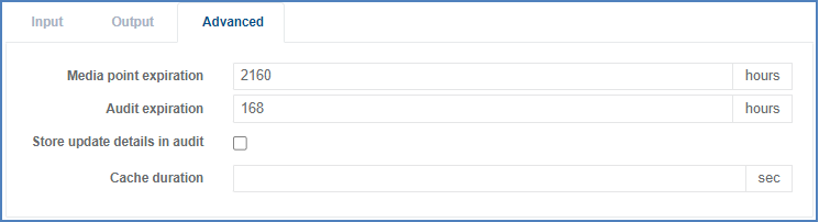 Parameter Description Media point expiration Value in hours. It defines how long media point will be maintained in Prisma VPM database. Audit expiration Value in hours. It defines how long audit information will be maintained in Prisma VPM database. Store update details in audit Allow to store update details which can be returned in the audits Cache duration Cache value in seconds. Prisma Viewing Policy Manager may be accessed by many other Prisma services (such as Stream Conditioning for instance).